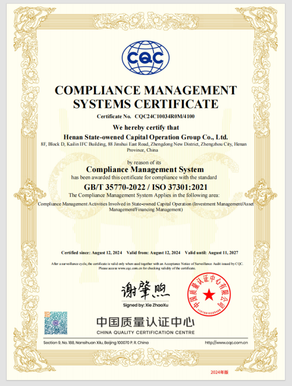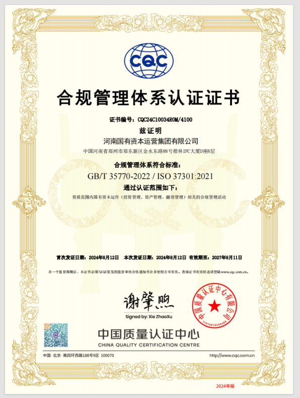 8月13日,中国中检河南公司助力河南国有资本运营集团有限公司(以下简称“河南资本集团”)成功获得中国中检所属中国质量中心CQC颁发的合规管理体系认证证书。河南资本集团成为首家通过ISO37301:2021和GB/T35770-2022《合规管理体系