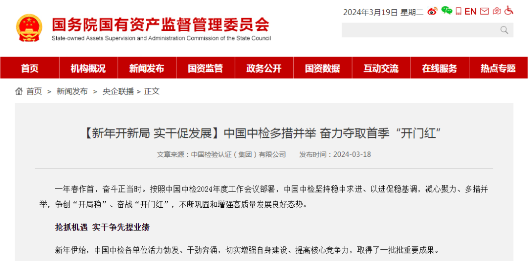 新年开新局,实干促发展。2024年是推进国企改革深化提升行动的关键一年,也是中国中检“十四五”规划目标的攻坚之年。集团系统深刻领会特殊使命,准确把握发展机遇,更加坚定发展信心,努力彰显功能作用,全力以赴奋战“新开局”,跑出发展“加速度”。近日,《中国中检多措并举 奋力夺取首季“开门红”》一文在国务院国资委官网刊发,全文如下:
